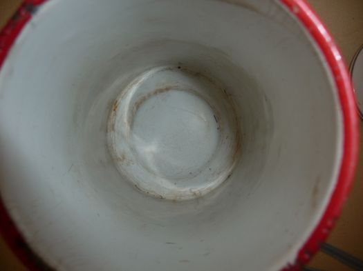 This one is rather in good condition ; inside, we can see that it has been used. There is a very small chip under (not worrying). The button of the lid has a chip and has been covered with paint (that you can delete with a knife if you wish).