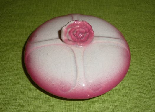 Uncommon majolica canister for salt, with a nice button on the lid, with rose's shape.