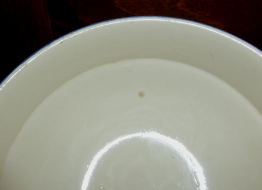 Cheap price because there is a stain that you can see on photo and a hairline which doesn't cross inside, so nothing really important ! Third and fourth photos.