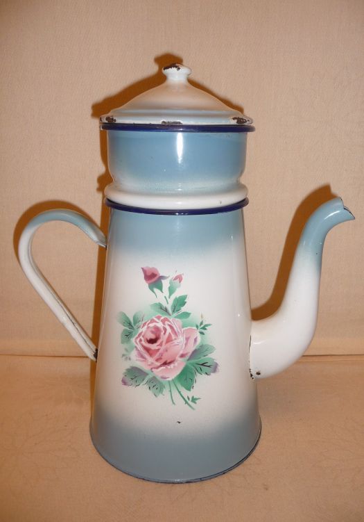 Condition is OK in comparison with its age ; 3 small chips under Japy's mark ; chips on the edge of the lid and on the button (which has a hole) ; inside, it is black but not rusted and there is no hole ; the top filter is missing.